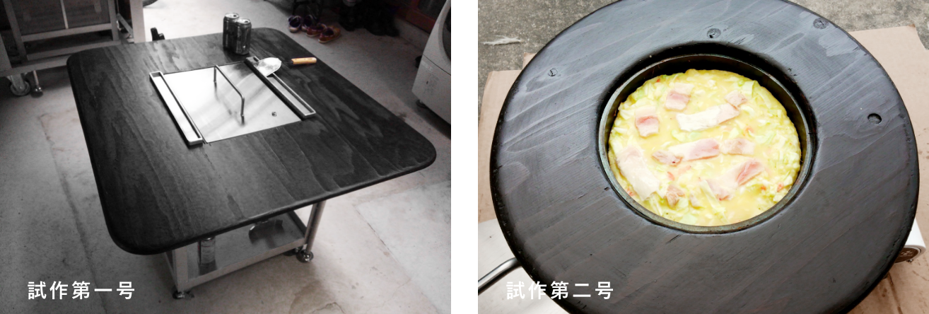 試作第二号は円盤型鉄板プレートで、カセットコンロが使えるタイプにしました。お好み焼きやホットケーキがまん丸ふっくら焼け、分厚い焼き上がりとふわふわな食感で気持ちも昂りました。
