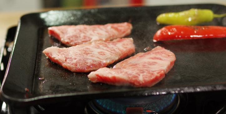 薄い鉄板ほど加熱部の熱が垂直にすぐ伝わるため、熱源近くは焼けすぎます。一方厚い鉄板は素材との間に距離ができ、熱が水平方向に広がるためおいしく焼けます。
